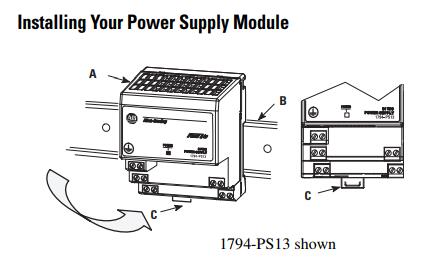 1. ขอ lip ที่ด้านหลังของโมดูลจ่ายไฟไปที่ด้านบนของราง DIN และหมุนโมดูลจ่ายไฟเข้ากับราง 2. กดโมดูลแหล่งจ่ายไฟลงบนราง DIN จนกว่าจะล้างออก แท็บล็อค C จะล็อคเข้าที่และล็อคโมดูลจ่ายไฟเข้ากับราง DIN 3. หากโมดูลแหล่งจ่ายไฟไม่ล็อคให้ใช้ไขควงหรืออุปกรณ์ที่คล้ายกันเพื่อเลื่อนแท็บล็อคลงในขณะที่กดโมดูลแหล่งจ่ายไฟให้ล้างลงบนราง DIN แล้วปล่อยแท็บล็อคเพื่อล็อคโมดูลแหล่งจ่ายไฟให้เข้าที่ . หากจำเป็นให้กดแท็บล็อคเพื่อล็อค