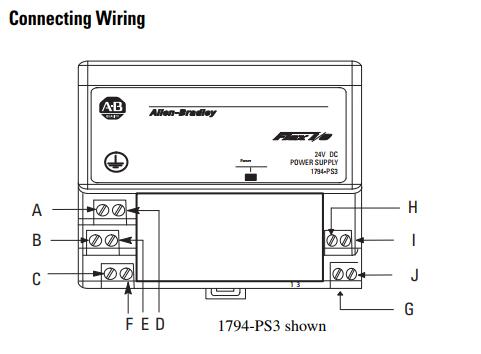 เทอร์มินัล A, B และ C เป็นขั้วจ่ายไฟ 120 / 230V เทอร์มินัล D, E และ F มีให้บริการสำหรับการปรับกำลังไฟ 120 / 230V ไปยังโมดูลแหล่งจ่ายไฟอื่น 1794-PS หากใช้กำลังไฟ 120 / 230V ไปยังแหล่งจ่ายไฟคุณยังสามารถจ่ายไฟให้กับโมดูล ac 120 / 230V ที่สอดคล้องกันในระบบ FLEX I / O ของคุณ